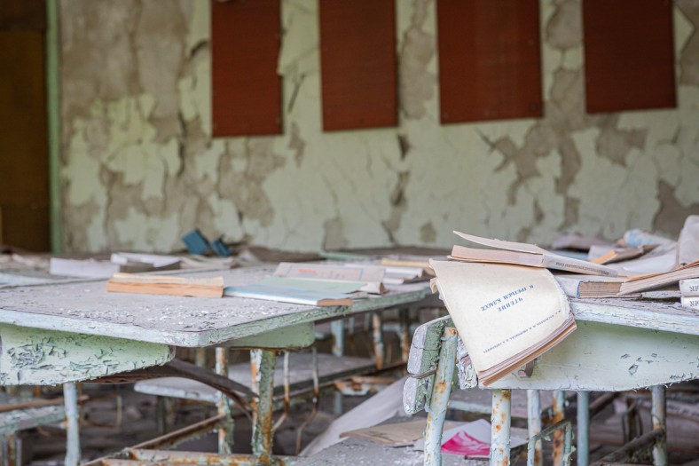 Finalmente, la última parada es la ciudad fantasma de Pripyat. Tal vez una de las imágenes más icónicas del desastre de Chernobyl es la rueda de la fortuna surgiendo a la distancia entre los edificios abandonados de lo que una vez fue una moderna urbe donde hacían vida 50 mil personas, en su mayoría jóvenes. Visualmente, es la parte más impresionante de la visita… Pripyat, a diferencia de otras ciudades fantasmas, fue evacuada de imprevisto y sus habitantes apenas tuvieron un par de horas para llevarse lo que pudieran, además de que se les dijo que sería solo por unos días y por eso todo luce como si literalmente el tiempo se hubiese detenido: los cuadernos sobre los pupitres de la escuela, platos y cubiertos sobre las mesas de los restaurantes, juguetes en las cunas de las guarderías e incluso un vaso en una máquina expendedora de refrescos.
