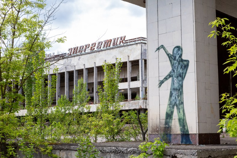 Por increíble que parezca, justo delante de la planta el nivel de radiación es relativamente bajo y resulta extraño ver grandes grupos de trabajadores con sus uniformes militares (no pertenecen al ejército, solo que esa ropa es la más barata y por eso se las entrega el gobierno) entrando y saliendo por sus puertas, para luego ser transportados en viejos autobuses blancos y azules, del mismo modelo utilizado para evacuar a la población en 1986. Aún más curioso es almorzar junto a ellos en el comedor de un edificio cercano, tras pasar el primer control de contaminación que consiste en pararse y “abrazar” los lados de una máquina que parece sacada de una peli de ciencia ficción.