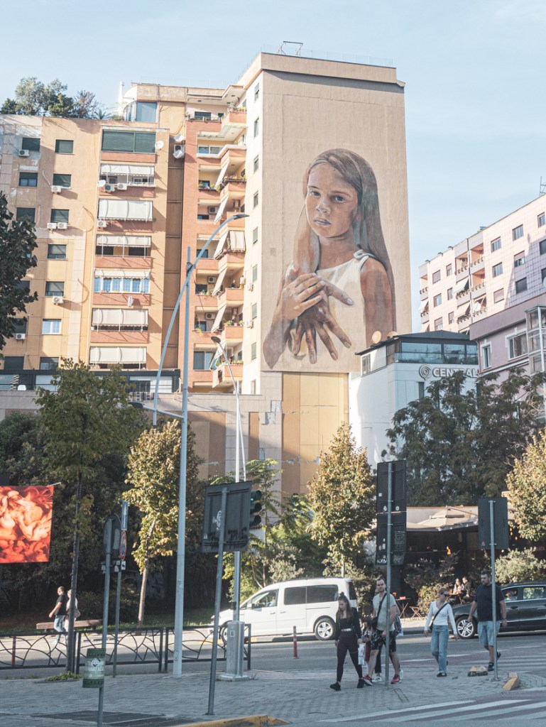 Otra visita muy interesante son los museos Bunk’Art. Hay dos, el 1 está en las afueras y debes tomar una autobús para llegar y el 2, en el centro. Me recomendaron que visitara el 2 porque es más pequeño (parece que en un punto el 1 puede volverse repetitivo y demasiado extenso si no tienes mucho tiempo) y está todo más concentrado. Aunque las exposiciones podrían estar un poco mejor cuidadas o actualizadas, es fascinante adentrarse en un bunker anti-nuclear y descubrir la historia del país, desde su independencia en 1912, pasando por la Segunda Guerra Mundial y especialmente durante la era comunista cuando absolutamente todo estaba controlado por el Estado. El precio son unos 9€. También escucharás hablar del Castillo de Tirana, pero en realidad es solo el resto de una muralla… el “castillo” en realidad es un centro comercial con tiendas de ropa, souvenirs y restaurantes. A las afueras encontrarás puestos más tradicionales de bebidas, artesanías y recuerdos que nunca pueden faltar. El Museo de Historia Nacional, cerrado al momento de hacer este post, tiene un mural espectacular que representa la historia de Albania a lo largo de los años y si quieres algo más moderno, gracias que el antiguo alcalde de Tirana y actual presidente del país es artista, llevó a cabo una iniciativa por lo que la ciudad está llena de intervenciones artísticas que cubren fachadas enteras de edificios.